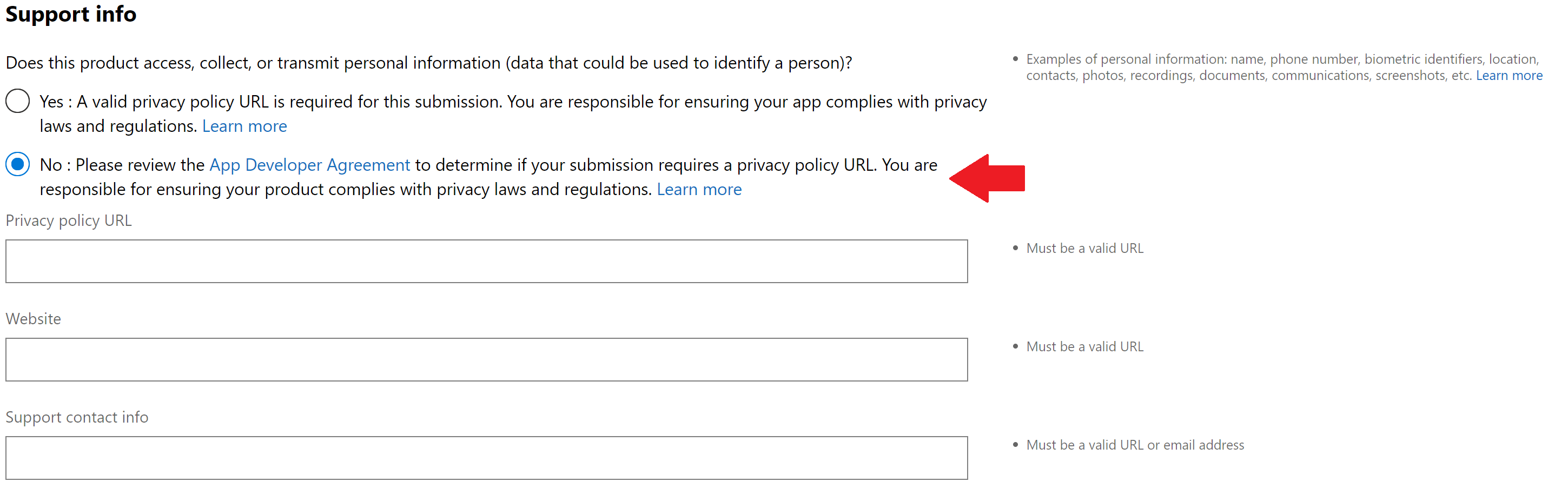 4. Click on the "yes" button for the privacy policy section and enter a valid URL.