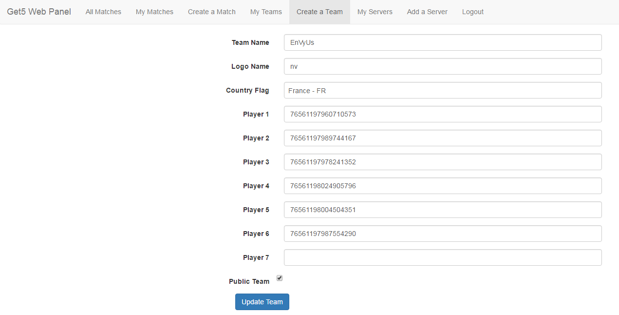 - Create teams on the "Create a Team" page by listing the steamids for each of the players