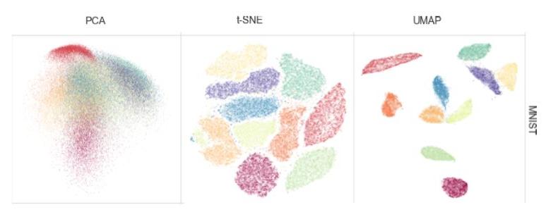 ![PCA graph from https://liorpachter.wordpress.com/2014/05/26/what-is-principal-component-analysis/]UMAP is based on a framework derived from Riemannian geometry and algebraic topology, using a manifold learning technique for dimensionality reduction. It essentially constructs a high-dimensional graph representation of the data, then optimises a low-dimensional graph to be as structually similar as possible. UMAP scales well and is able to run efficiently on large datasets.