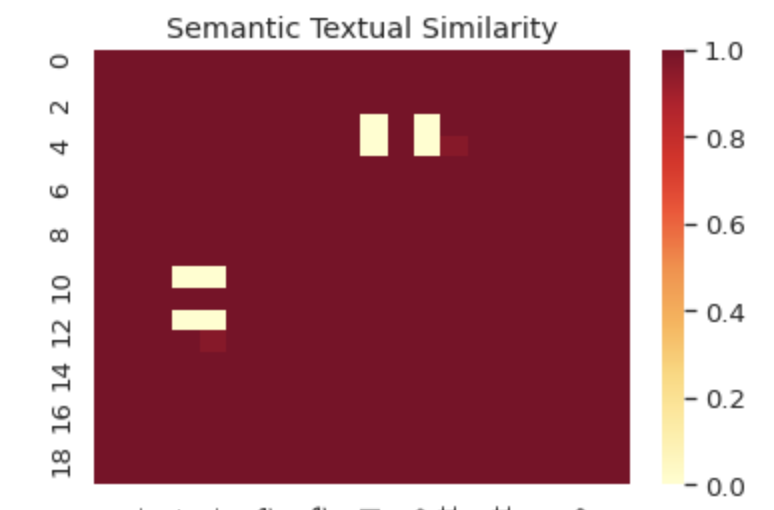 We ran 20 such comments through the Univeral Sentence Encoder as well as SBERT. We plotted the results in a confusion matrix below to visualise the similarity of the sentence vectors. The darker the colours, the more similar the models deemed the two sentences.