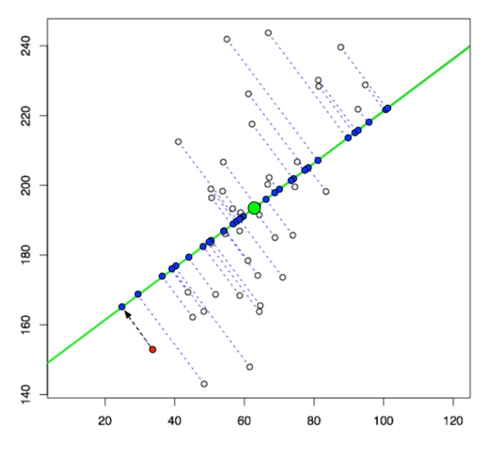 PCA works by first computing the covariance amongst all possible pairs of the variables in the data. Then, it compresses the initial variables into uncorrelated variables called principal components. It does this by solving the eigenvalue/eigenvector problem on the variables, which surface the variables with the highest amount of variance. For example, in the diagram below, the principal component is the green line that maximises the average squared distances from the data points represented by the white dots. This green line explains the largest amount of variance in this dataset.