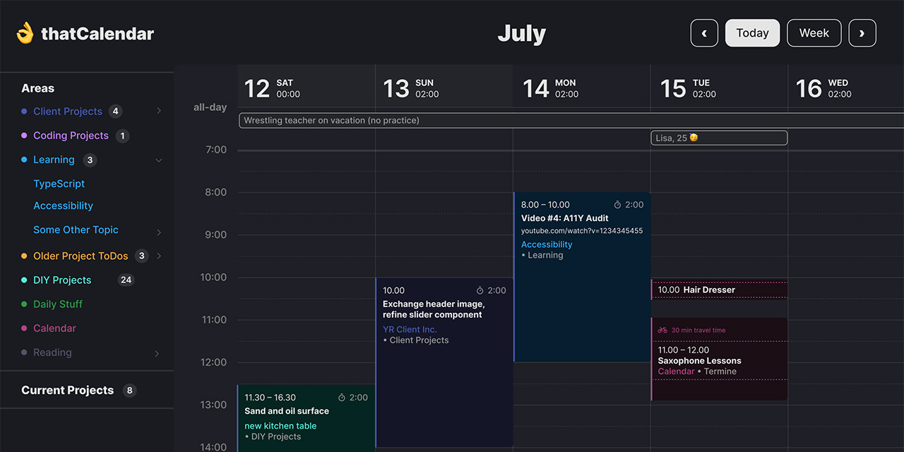I am learning a lot about date conversion (love you, date-fns! 💜), data storage structures and the complexity of something as seemingly simple as a calendar. Also spend way too much time crafting my own Notion-like combobox. The things you do for love, right?