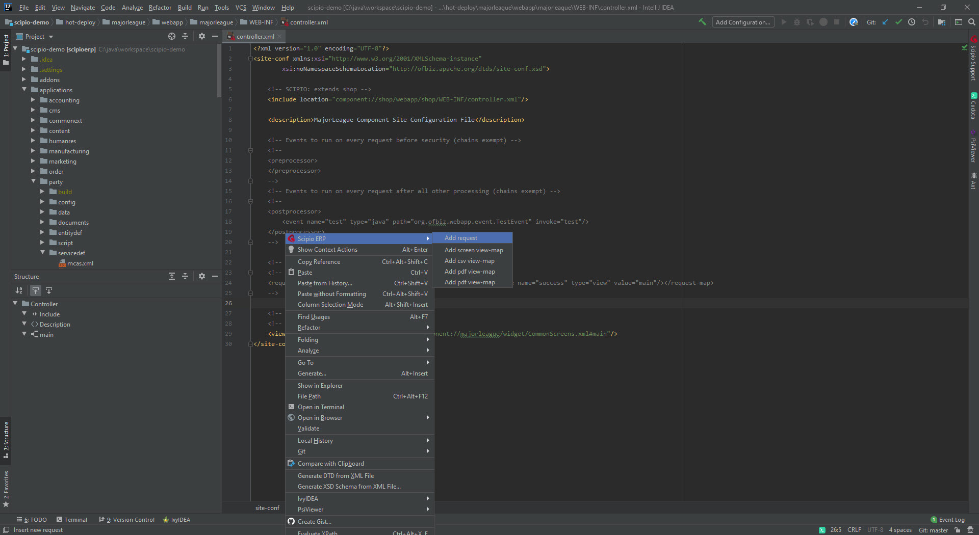 - Autocomplete options for all Scipio ERP & OFBiz files (widgets, menus, controller, services, entities etc)