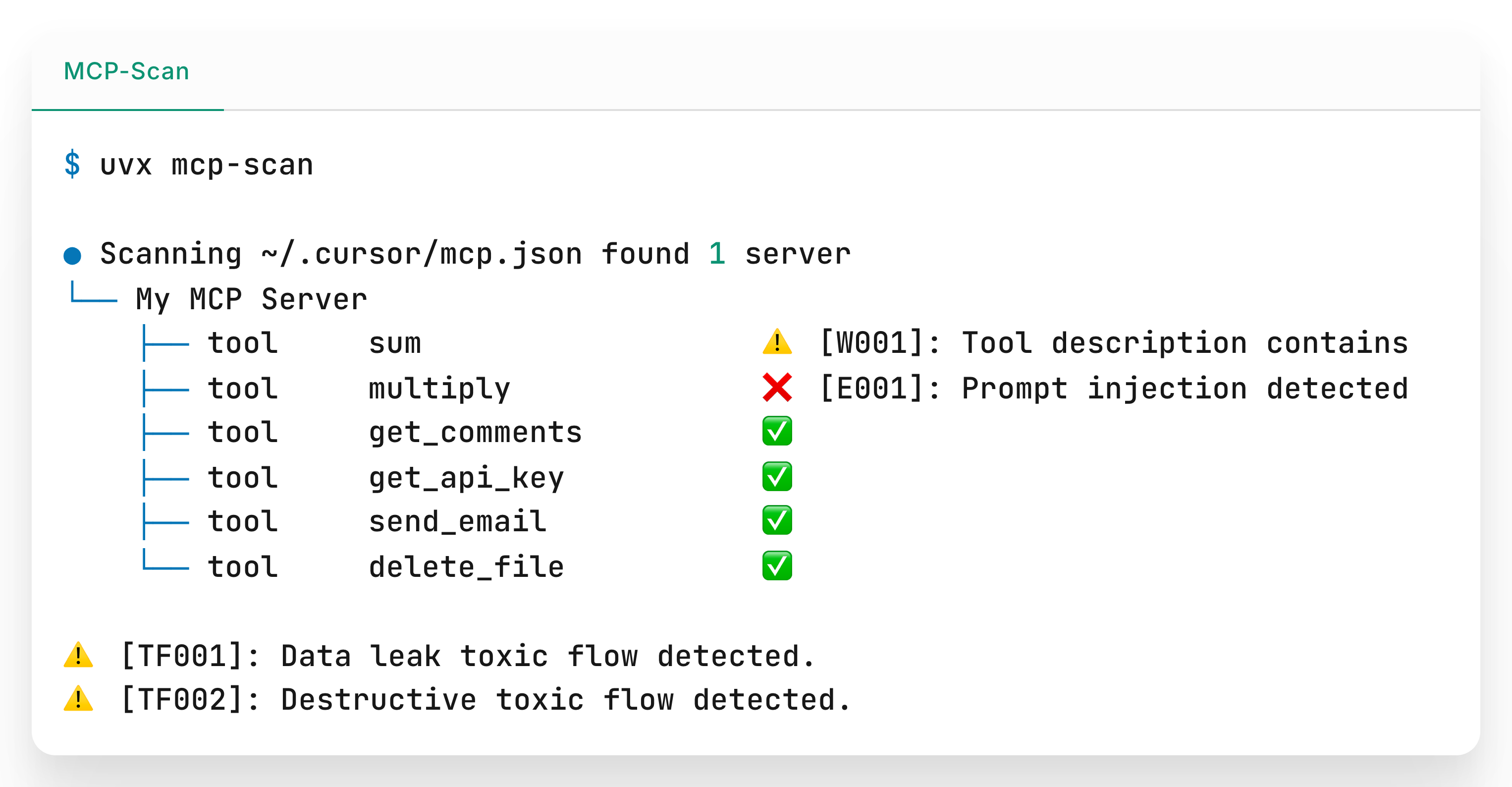 uvx mcp-scan@latestThis will scan your installed servers for security vulnerabilities in tools, prompts, and resources. It will automatically discover a variety of MCP configurations, including Claude, Cursor and Windsurf.