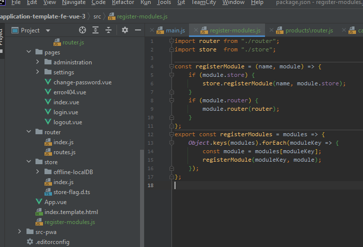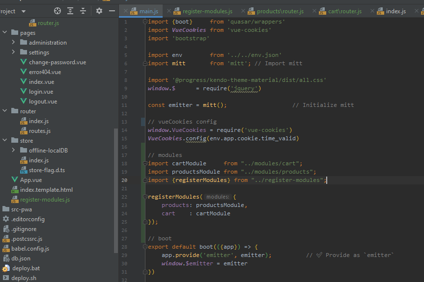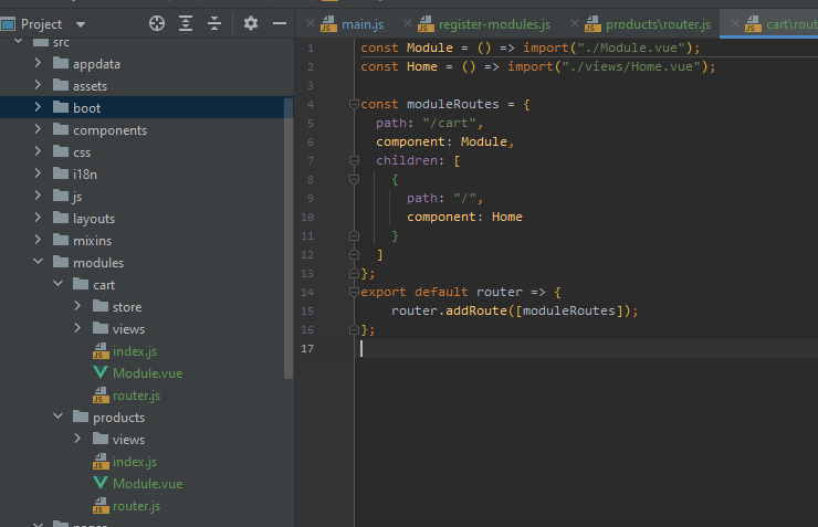Hi, I would like to know if it is possible to build a Quasar application with a modular approach? The routes should be added to the allready created router in the router/index.js file I have created a register modules js file: In my main.js i want to register all the modules: |