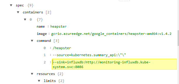 heapsterand add a--sink=influxdb:http://monitoring-influxdb.kube-system.svc:8086