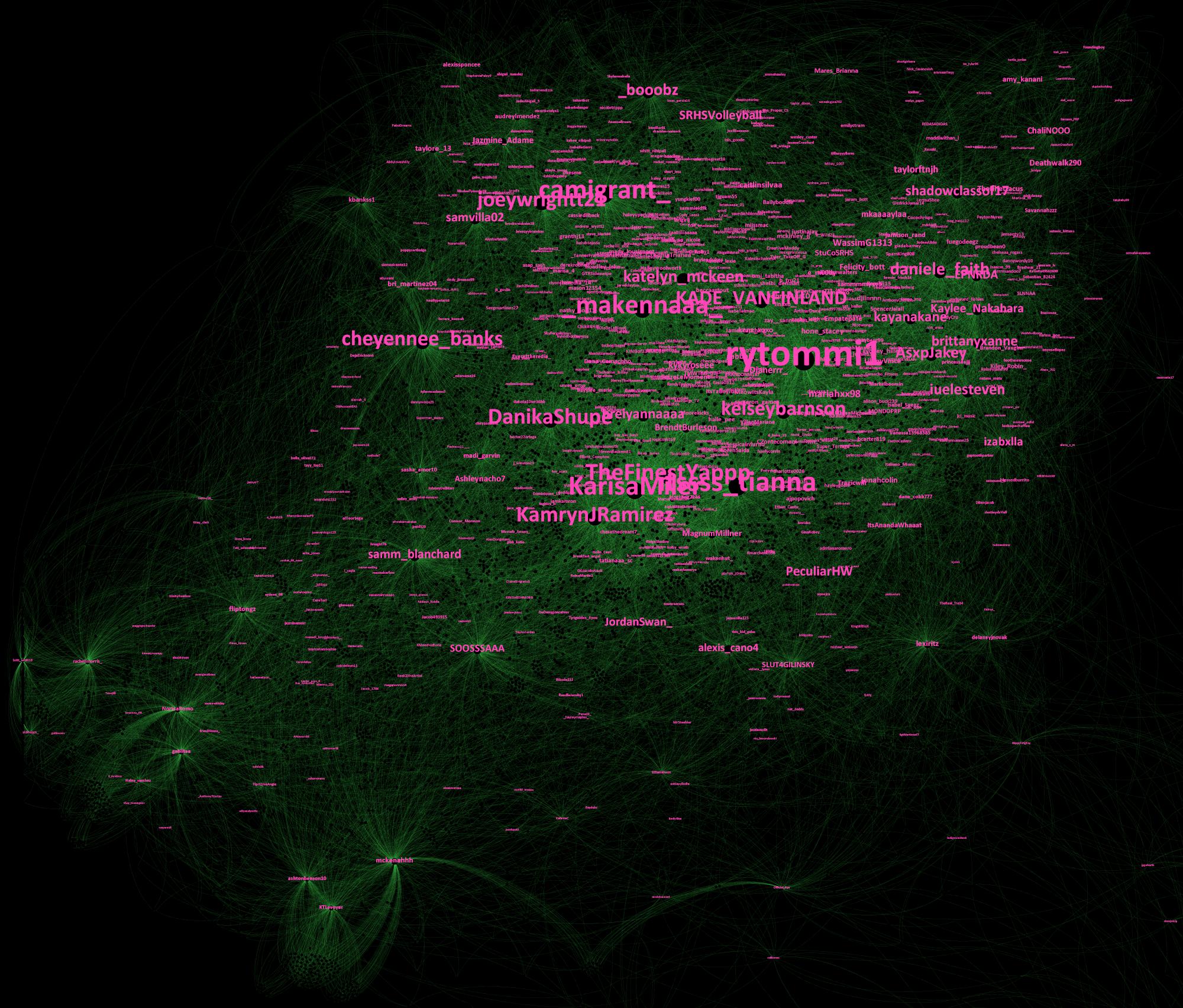 All data is pulled from tables using pymysql and relationships are matched using networkx. The clustering coefficient / degree of each user is calculated. If the a node is determined to be important enough, their username and screen name are pulled from twitter. All data is exported to a .graphml file to be rendered using a service such as SNAP or Gephi.