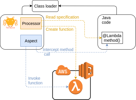 To implement the first part we used java built-in annotation processor linked to custom annotation. Annotation processors are being performed over the compilation phase. It means that after compilation of your project marked with particular annotations methods are already created at provider's service (AWS Lambda as first implementation).
