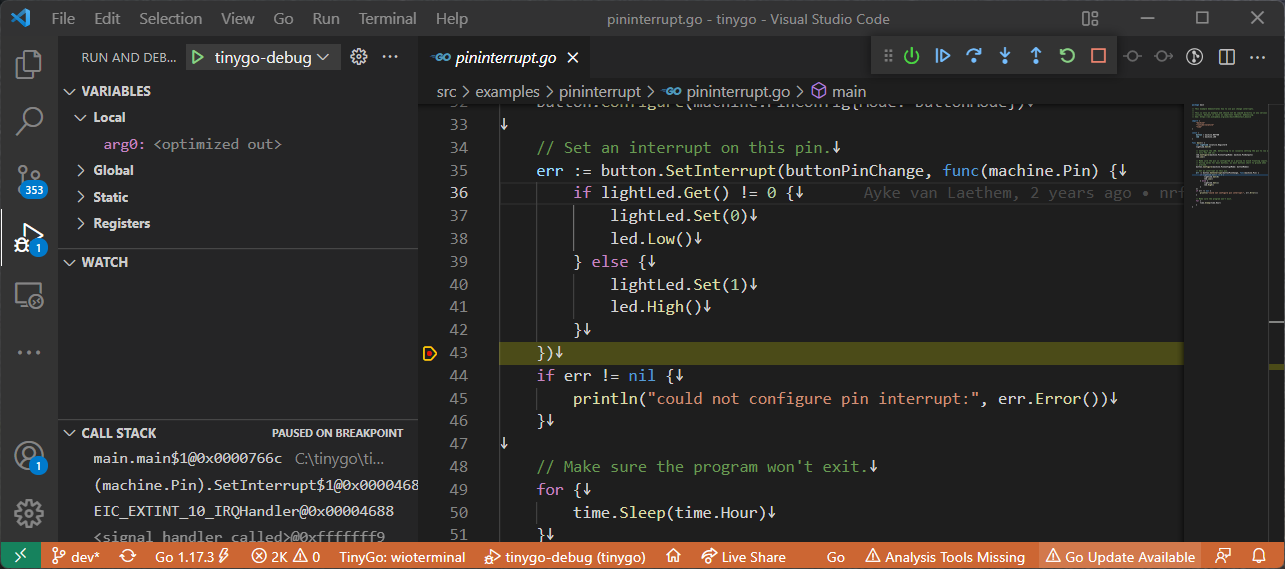 It looks like you are first building a binary using tinygo build and then debugging it separately using the Cortex-M debug extension, correct?