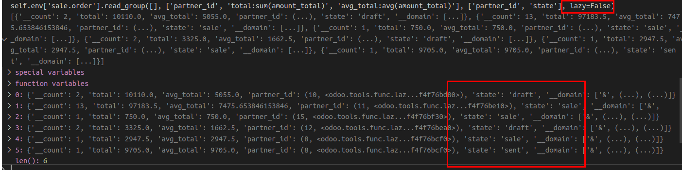 self.env['sale.order'].read_group([], ['partner_id', 'total:sum(amount_total)', 'avg_total:avg(amount_total)'], ['partner_id', 'state'], lazy=False)同等如下 SQL