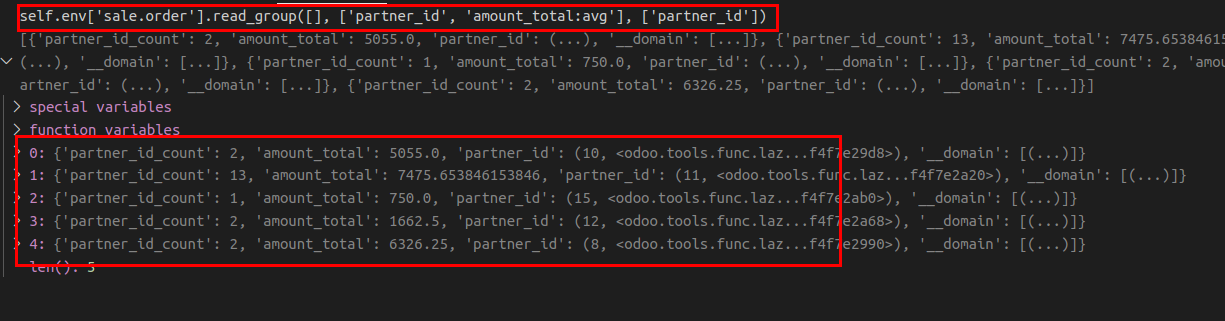 self.env['sale.order'].read_group([], ['partner_id', 'total:sum(amount_total)', 'avg_total:avg(amount_total)'], ['partner_id'])同等如下 SQL