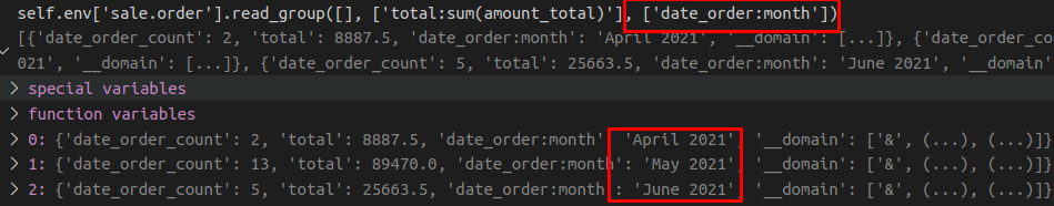 self.env['sale.order'].read_group([], ['total:sum(amount_total)'], ['date_order:month'])同等如下 SQL